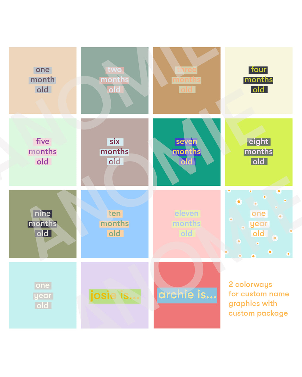 Twelve 8 x 8 inch images for showcasing your baby's monthly milestones, culminating in a celebratory daisy 1 year graphic (non daisy option included as well)!
