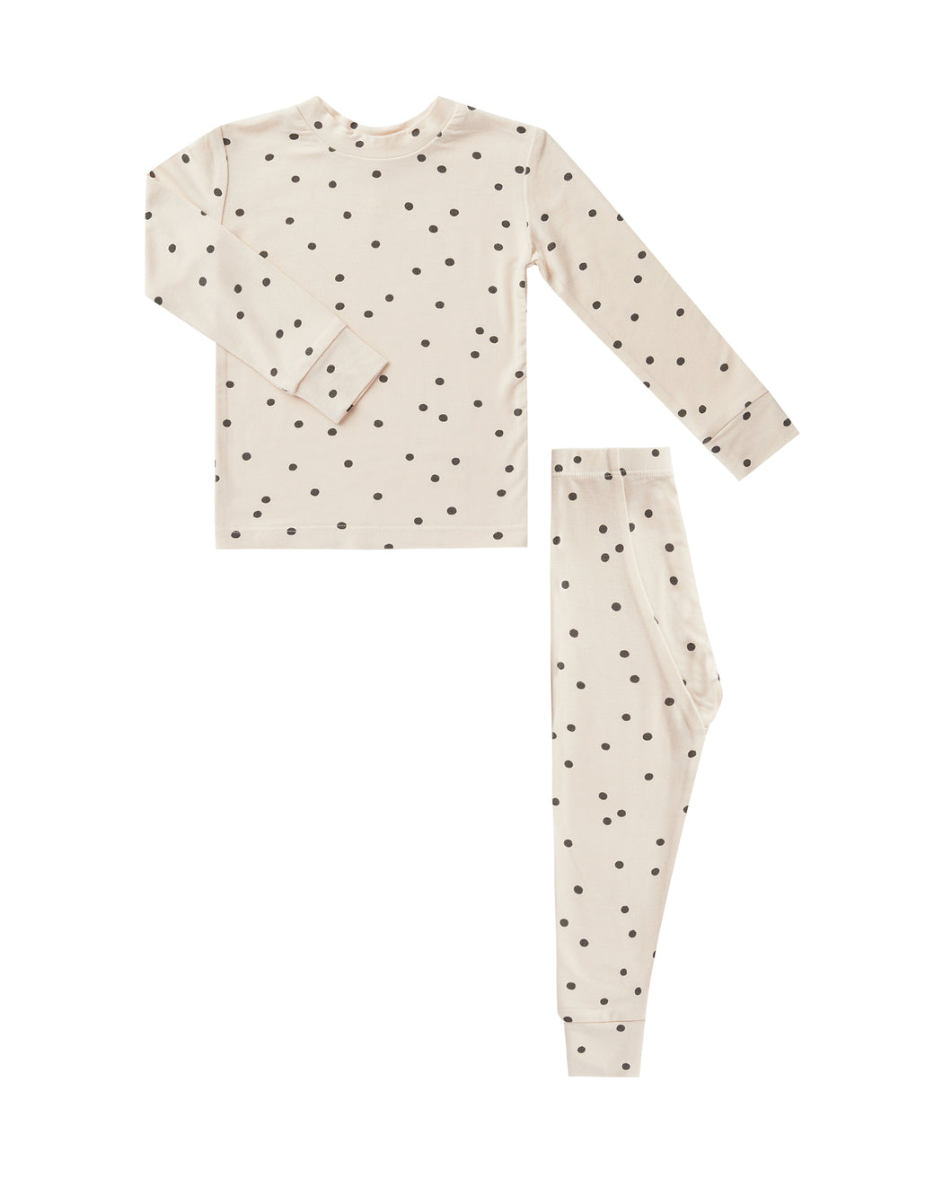 A super cute dot print set featuring the softest long sleeve top and leggings with banded cuffs.