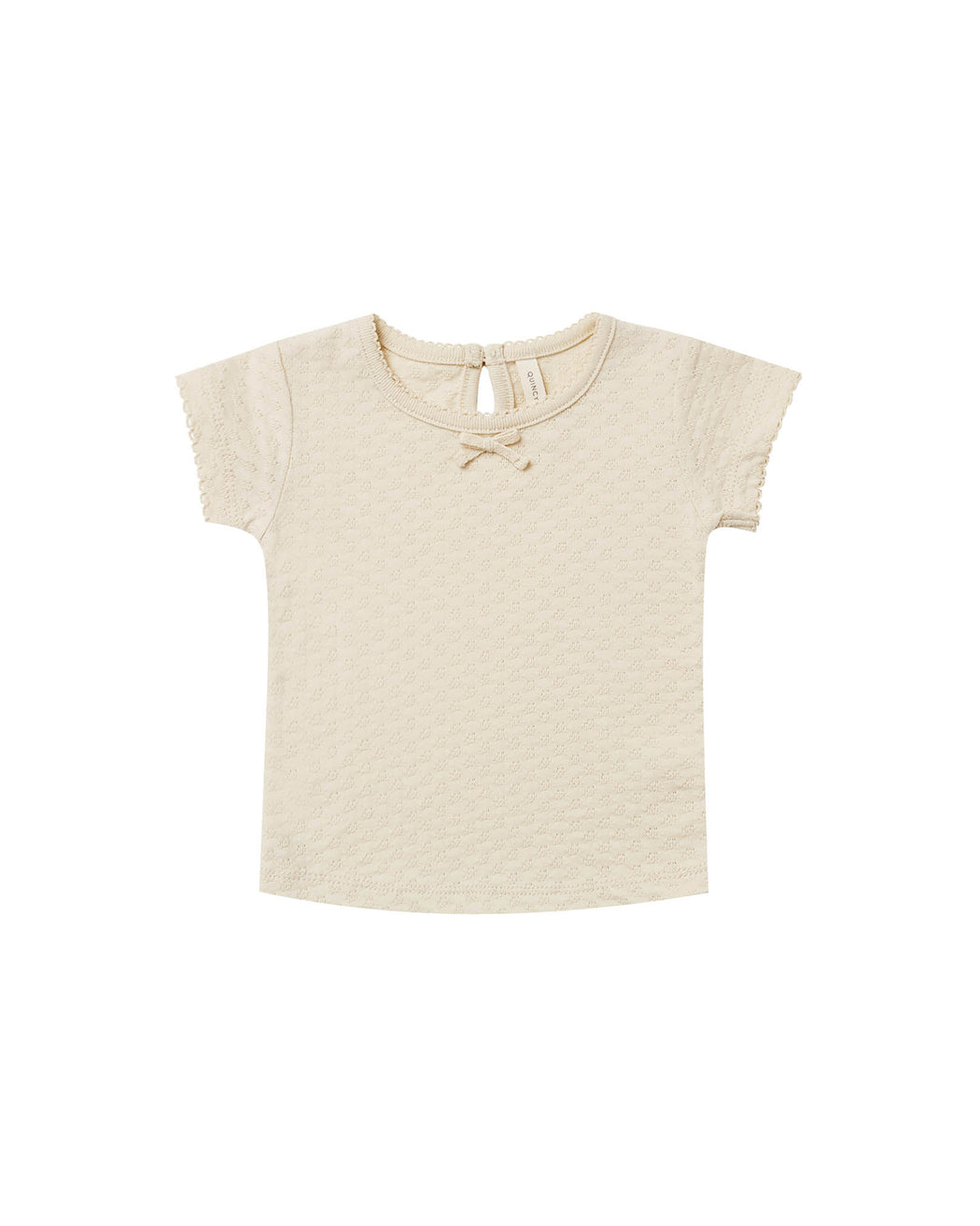 A short sleeve tee with bow detail along the scallop trimmed neckline and button back closure. Pair with matching leggings.