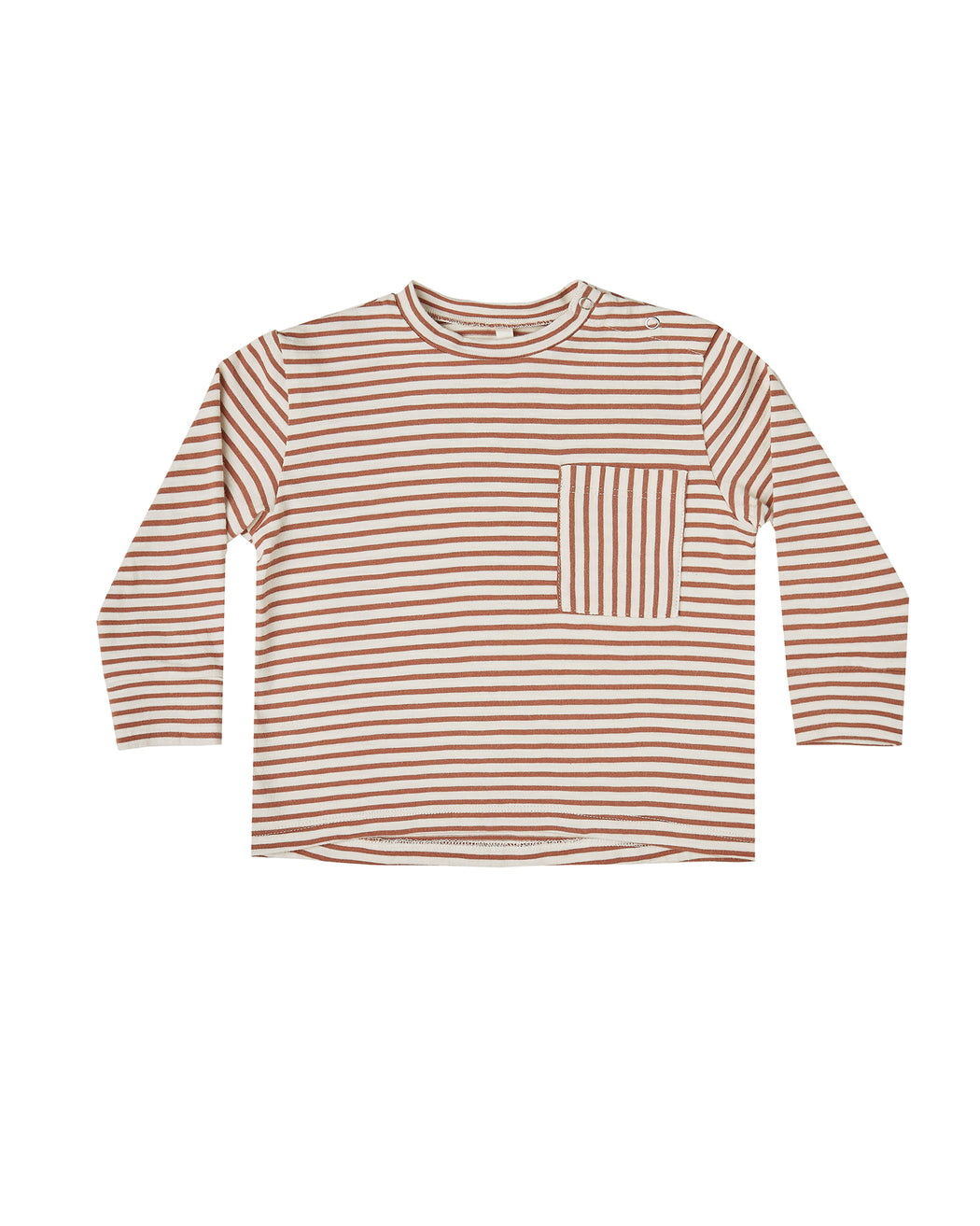 Loose fit longsleeve tee with neckband and bands at sleeve openings, front pocket, and naps at the shoulder for easy changing.