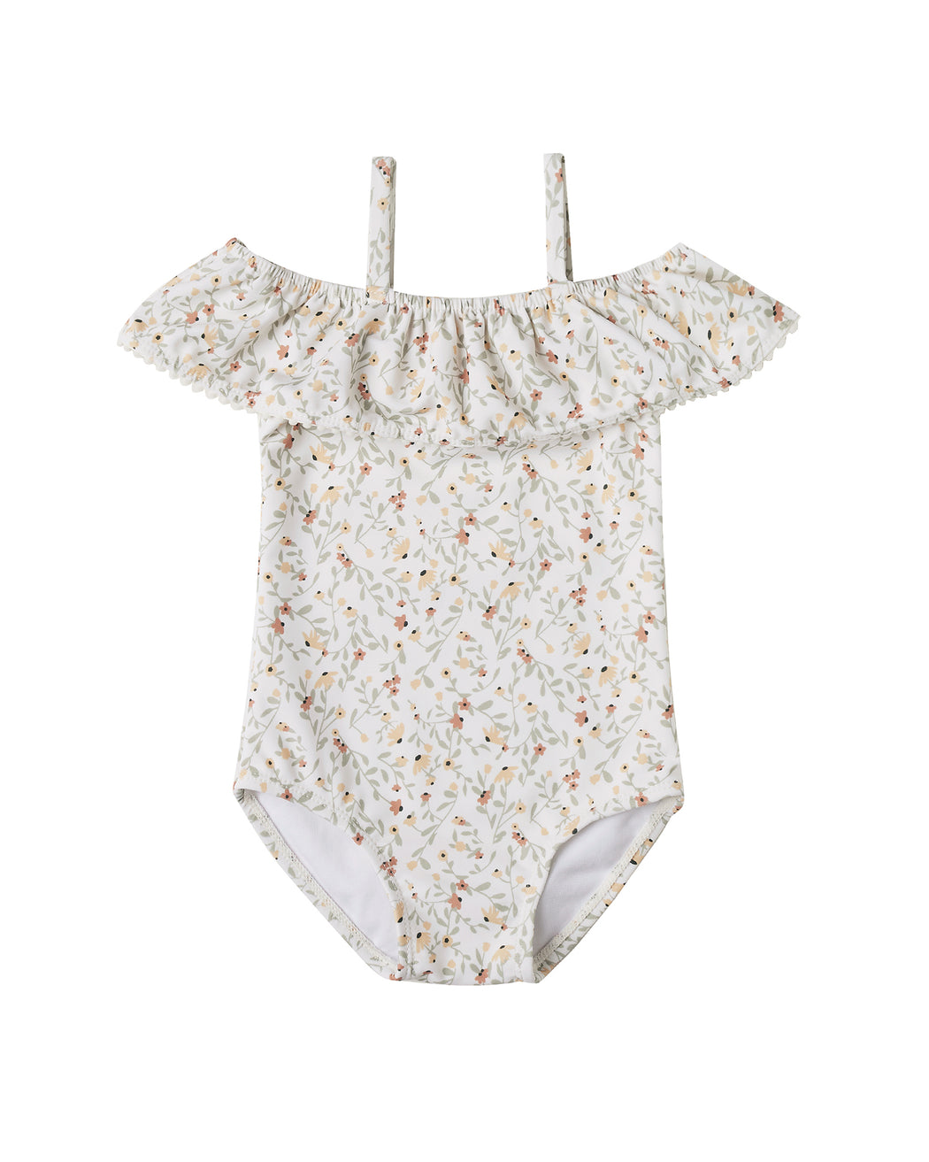 Adorable one-piece bathing suit has an off the shoulder ruffle with trim detailing and spaghetti straps.