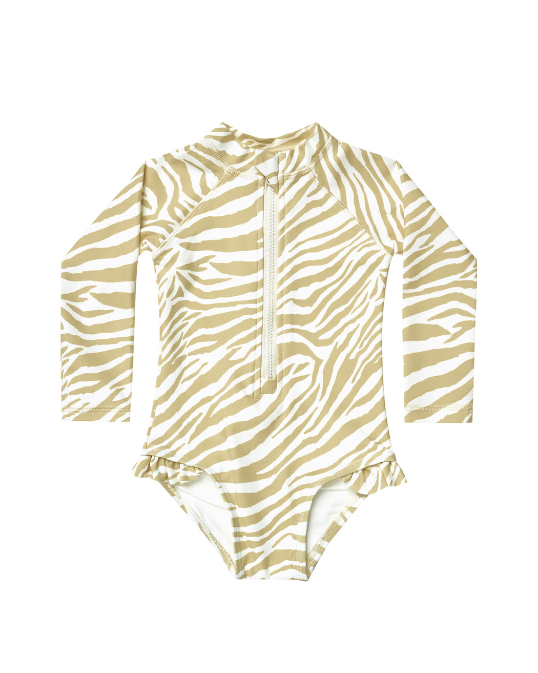 Stay protected from the sun (UPF 50+ in style with these super cute print, zipper front closure, and ruffle detail at the leg openings.
