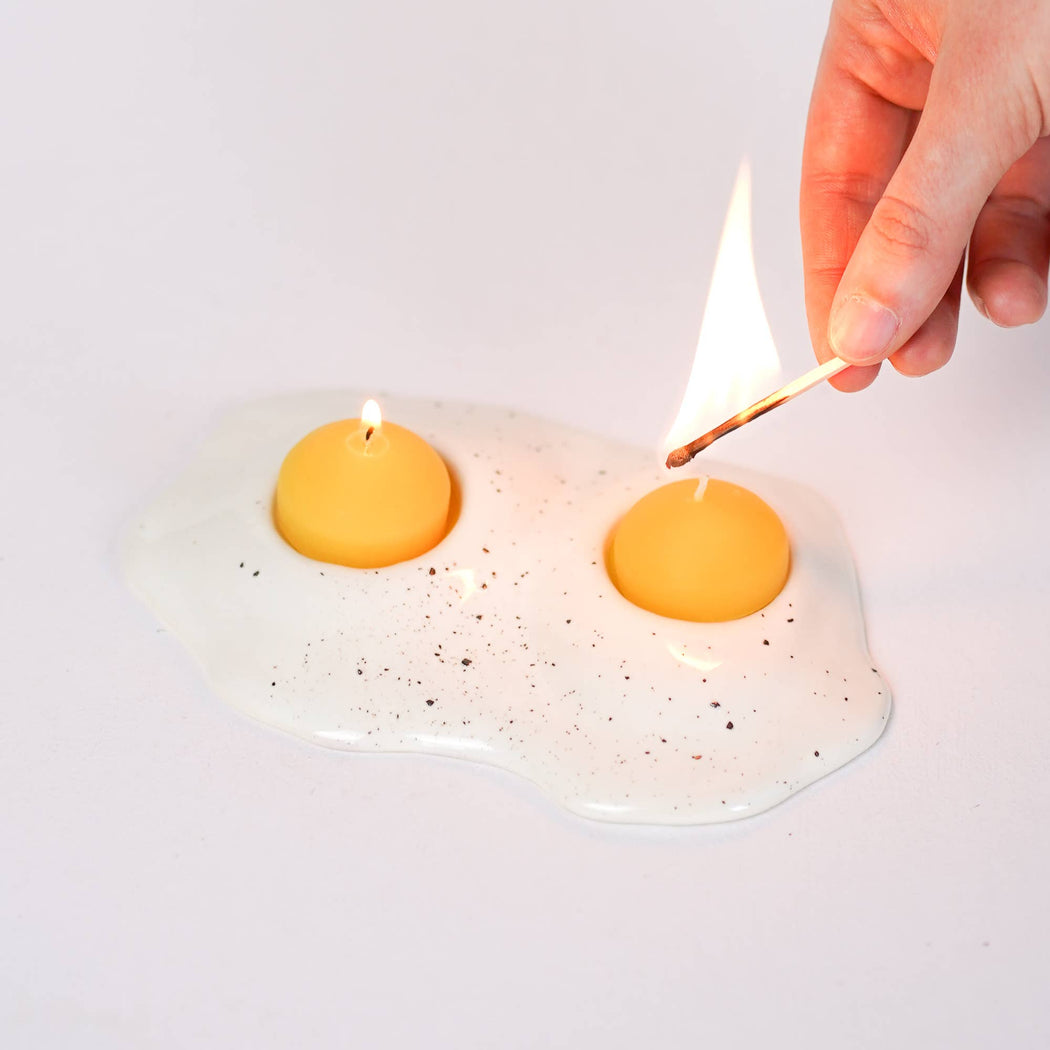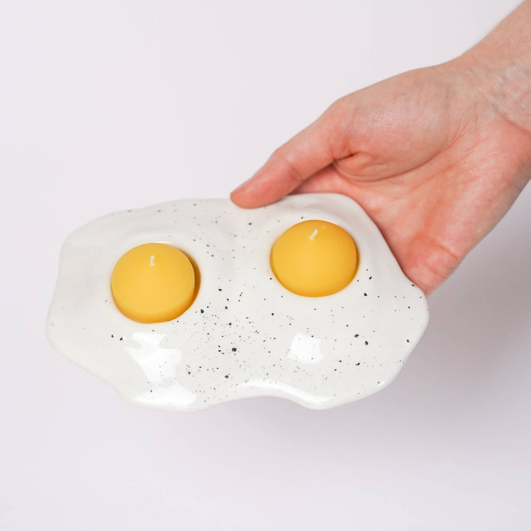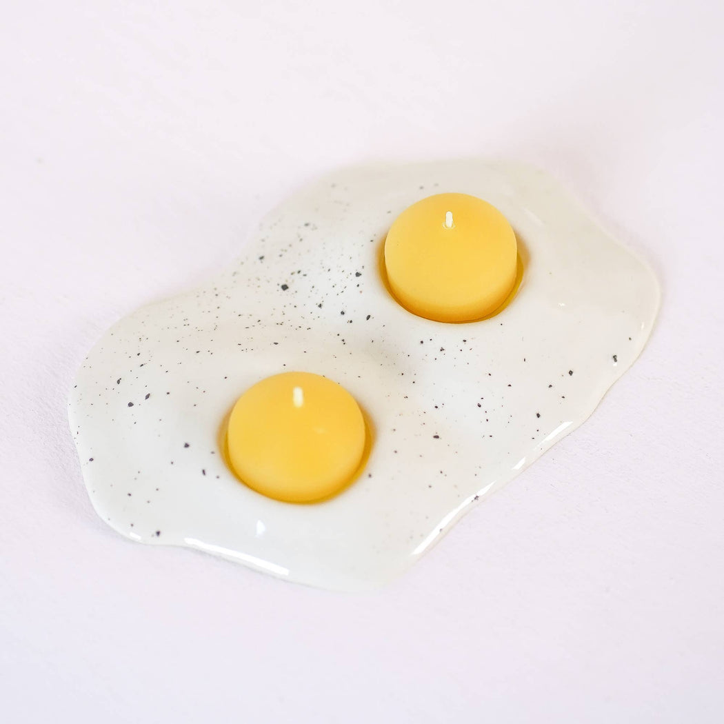 For the two-egg breakfast enthusiasts out there! These unique candle holders feature a handmade ceramic "egg white" base with a sprinkling of "salt and pepper" and two hand poured beeswax tea light "yolks".