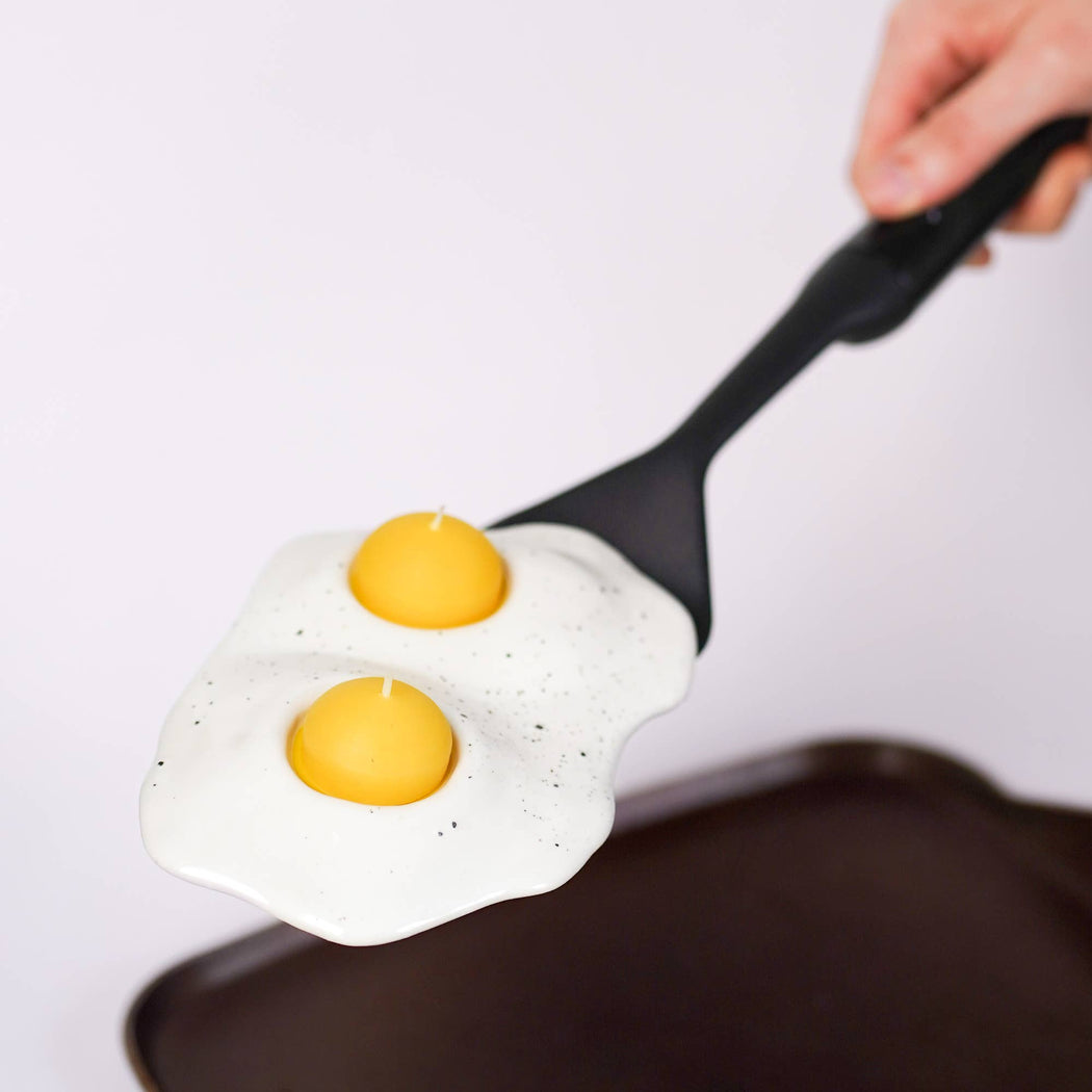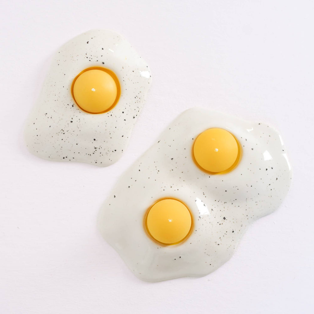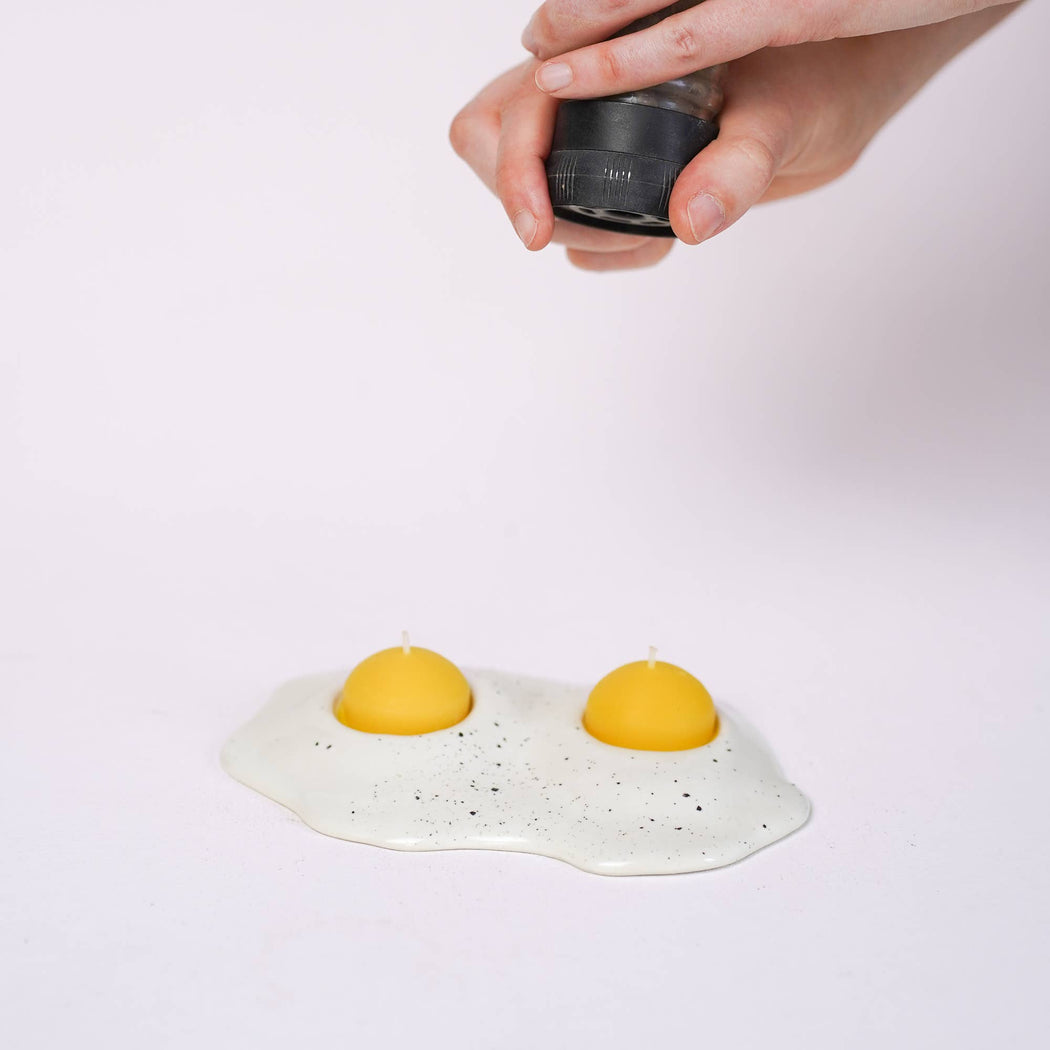 For the two-egg breakfast enthusiasts out there! These unique candle holders feature a handmade ceramic "egg white" base with a sprinkling of "salt and pepper" and two hand poured beeswax tea light "yolks".