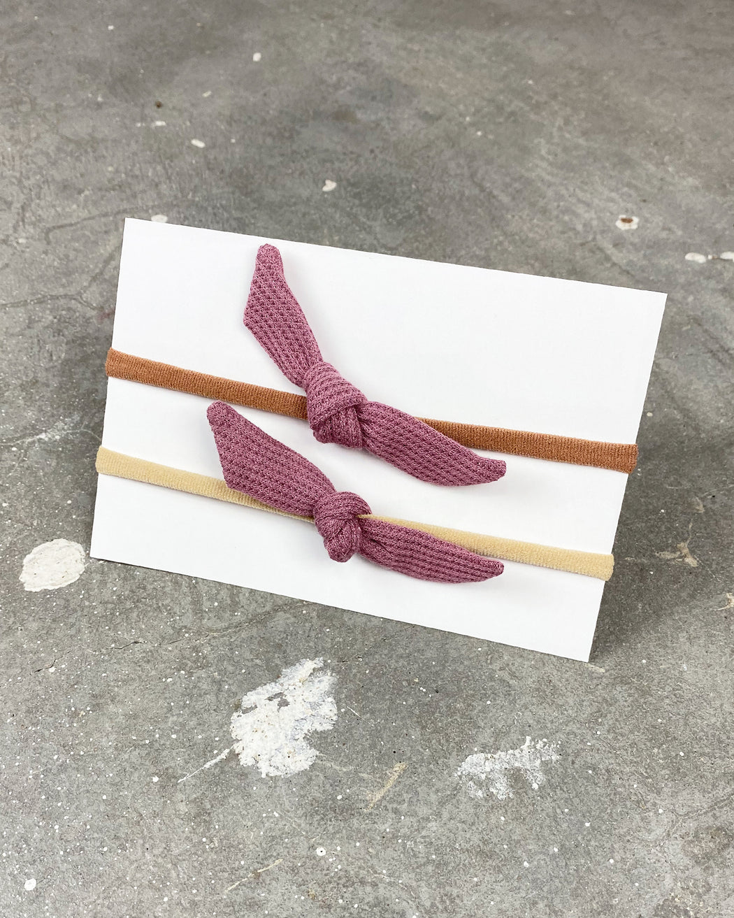 Sweet little mini bows on your color choice of stretchy nylon headband to best match your little one's hair or skin color. Can easily be untied and re-tied on elastics to grow with your child's hair styles.