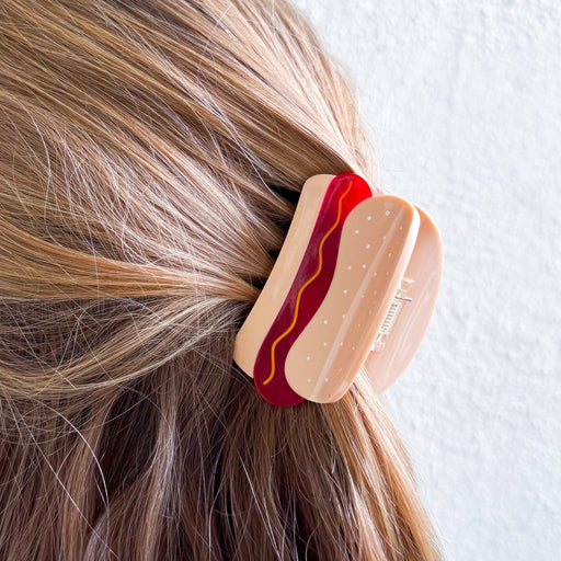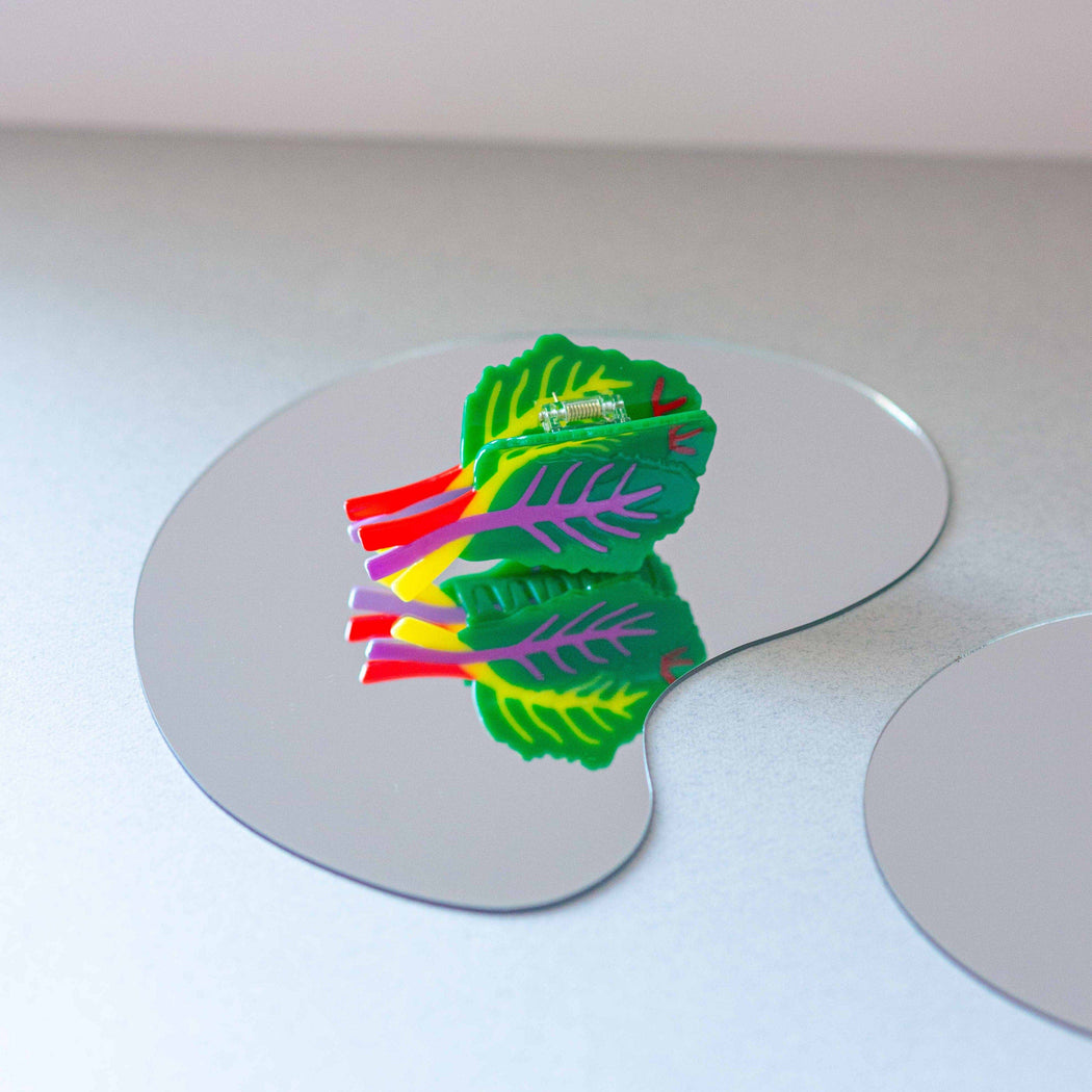 A cute and vibrant rainbow chard hair claw made from cellulose acetate, a plant-based alternative to plastic.