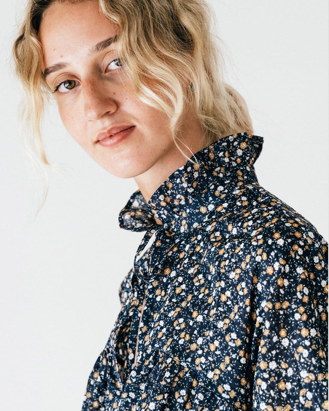 A relaxed fit top with drop sleeve, ruffled cuffs and neck, and a deep V tie closure