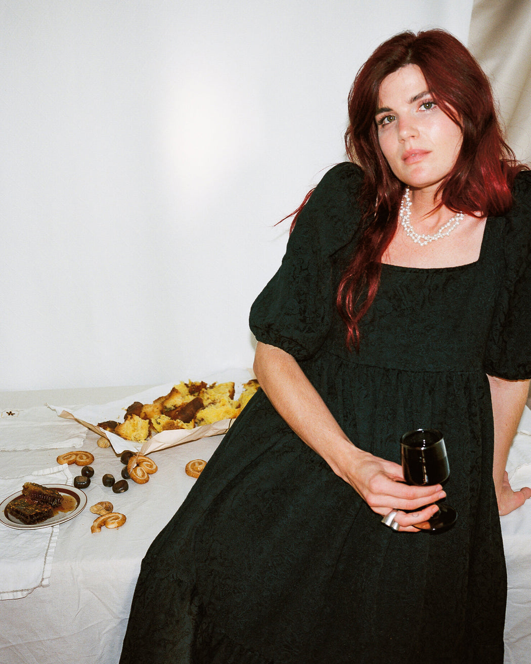 A beautiful puff sleeve dress with fully lined bust, invisible side zip, mid-weight cotton, and pockets in a special black brocade fabric.