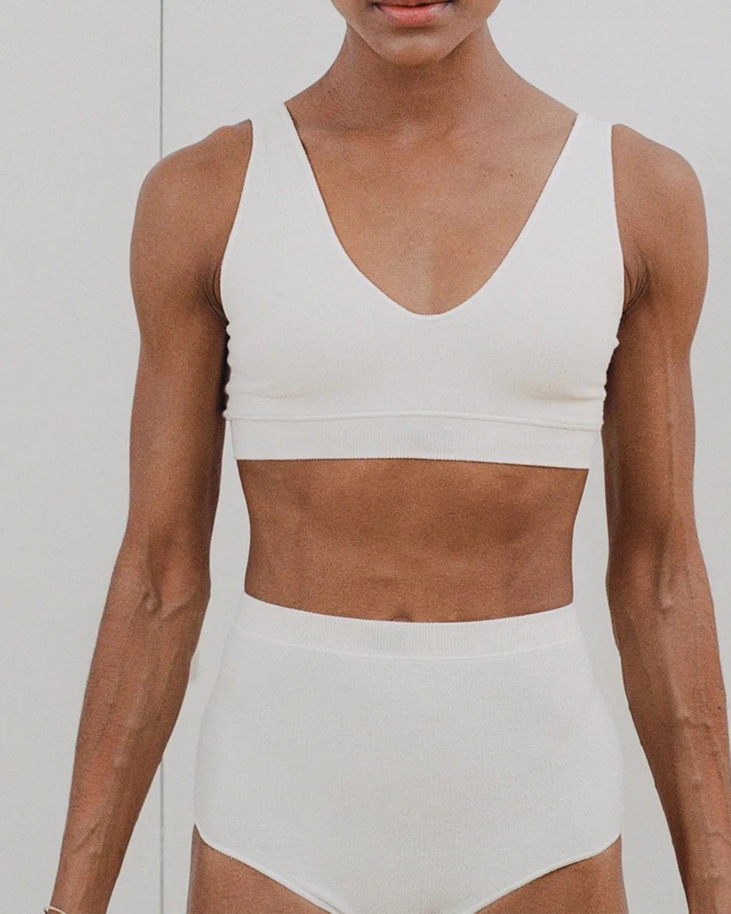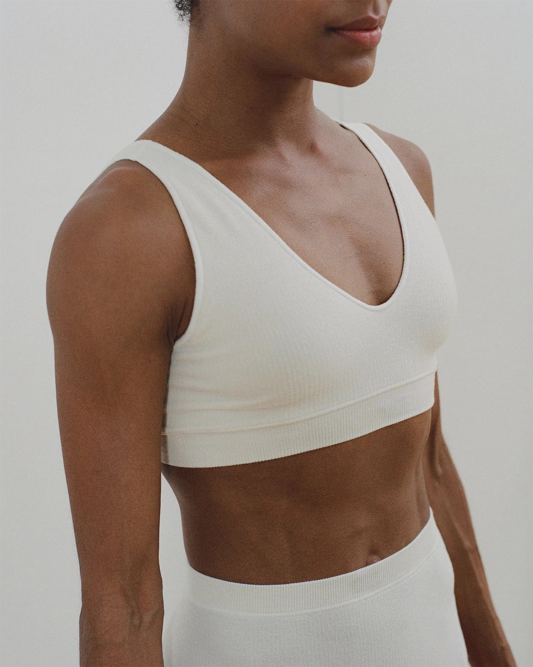 A sporty bra with supportive double layer knit and internal shaping for additional support in a soft and stretchy rib knit.