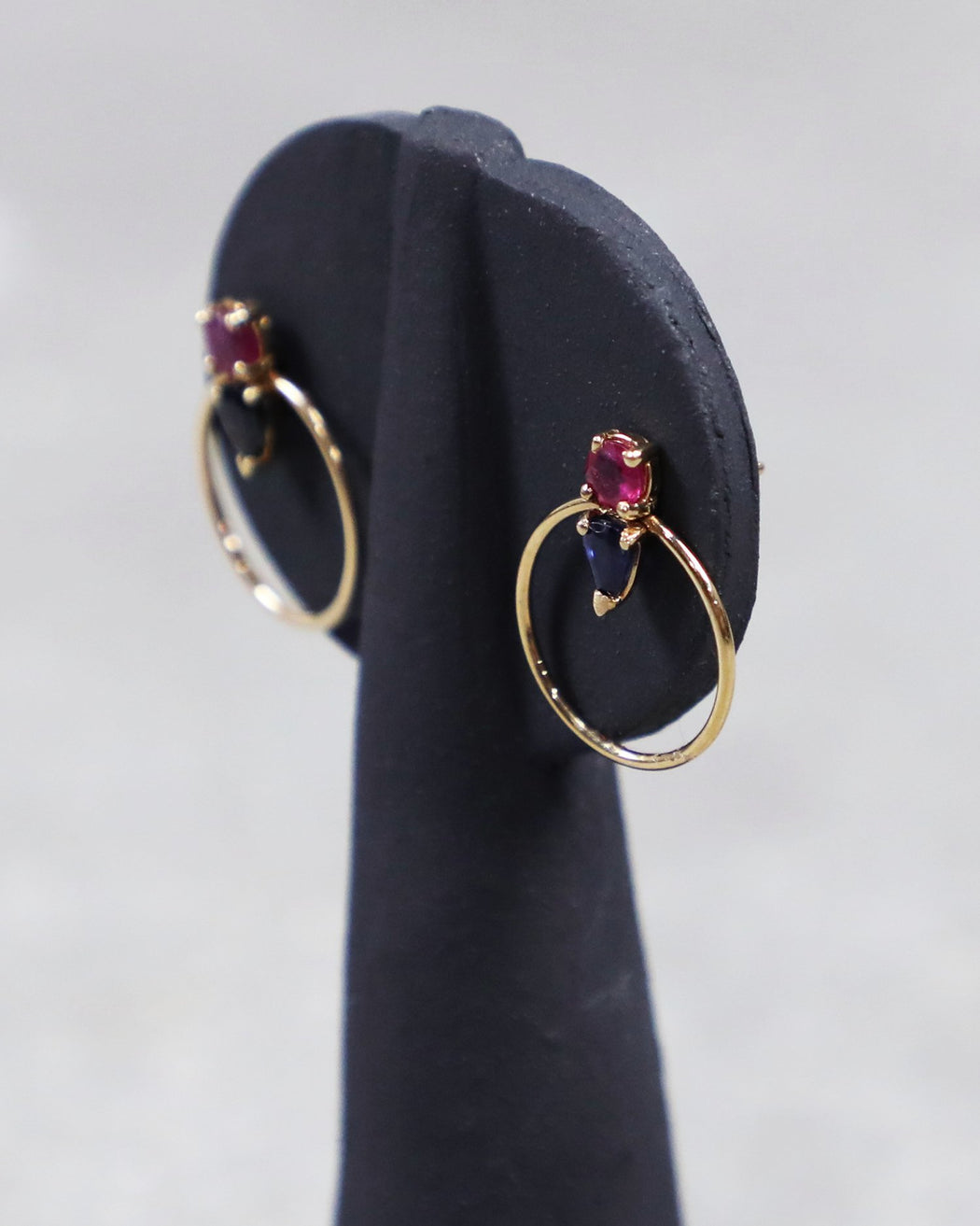 A 14k yellow gold earring with a ruby and sapphire.