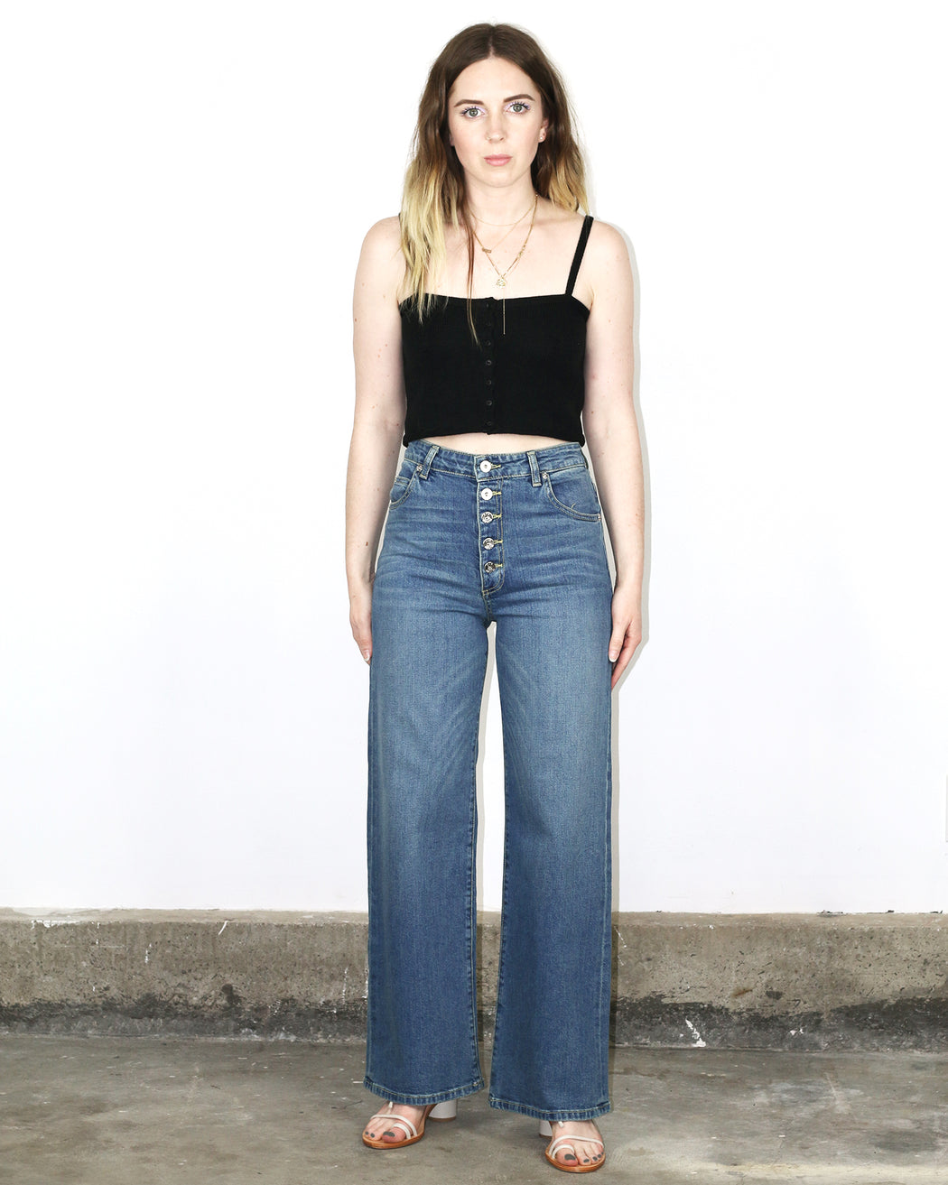The Charlotte Culotte in Venice wash is gently washed down to a warm, mid-tone blue jean with wide legs and exposed hardware.