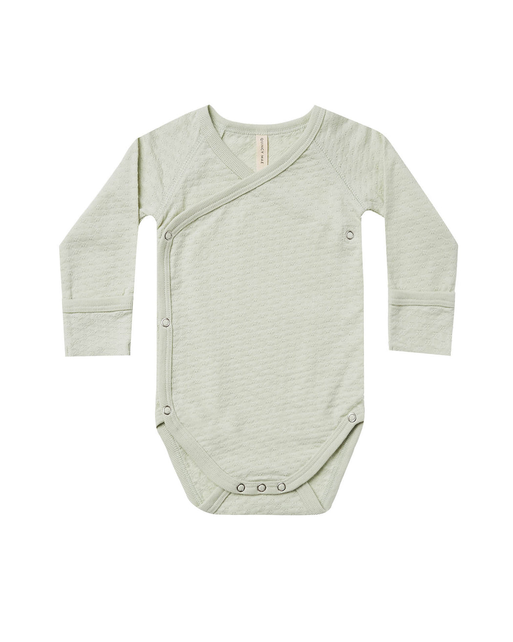 Made from a lightweight pointelle fabric, this kimono onesie snaps at the sides and along the inseam for a cozy, easy to diaper change, fit. Features fold over hand mitts.
