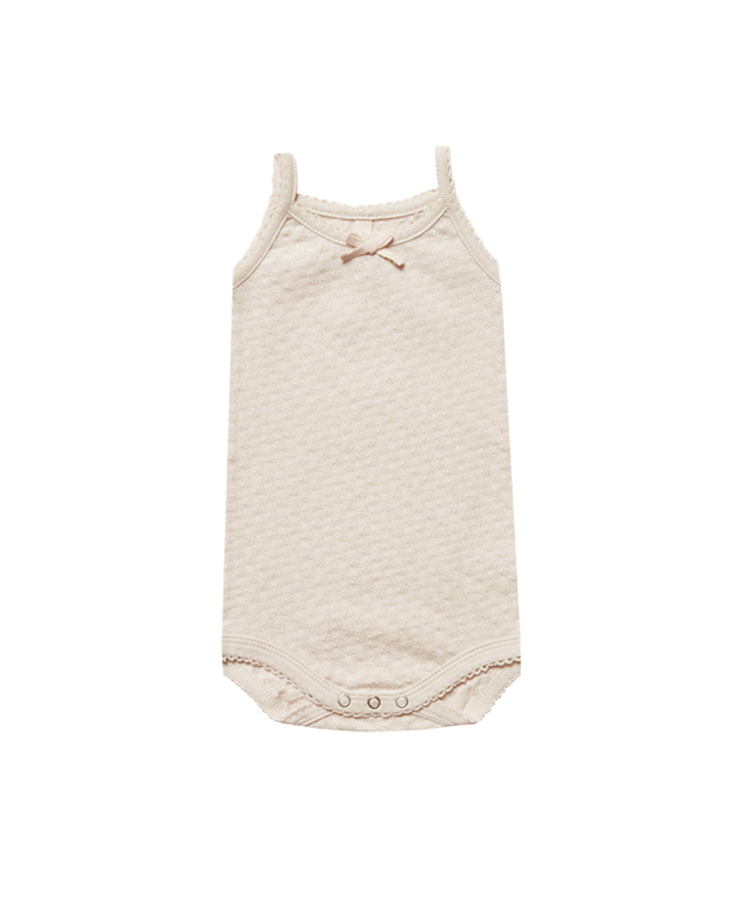 Made from a lightweight pointelle fabric, this cute tank onesie features a little bow on the necklace and inseam snaps for easy diaper changes.