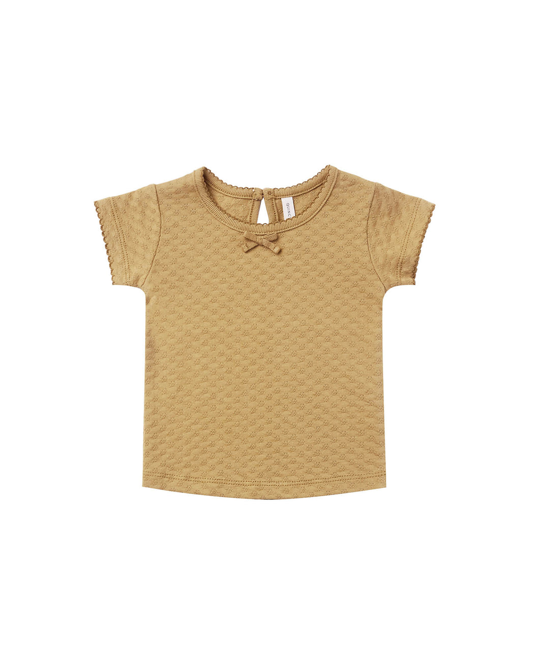 A short sleeve tee with bow detail along the neckline. Pair with matching leggings.