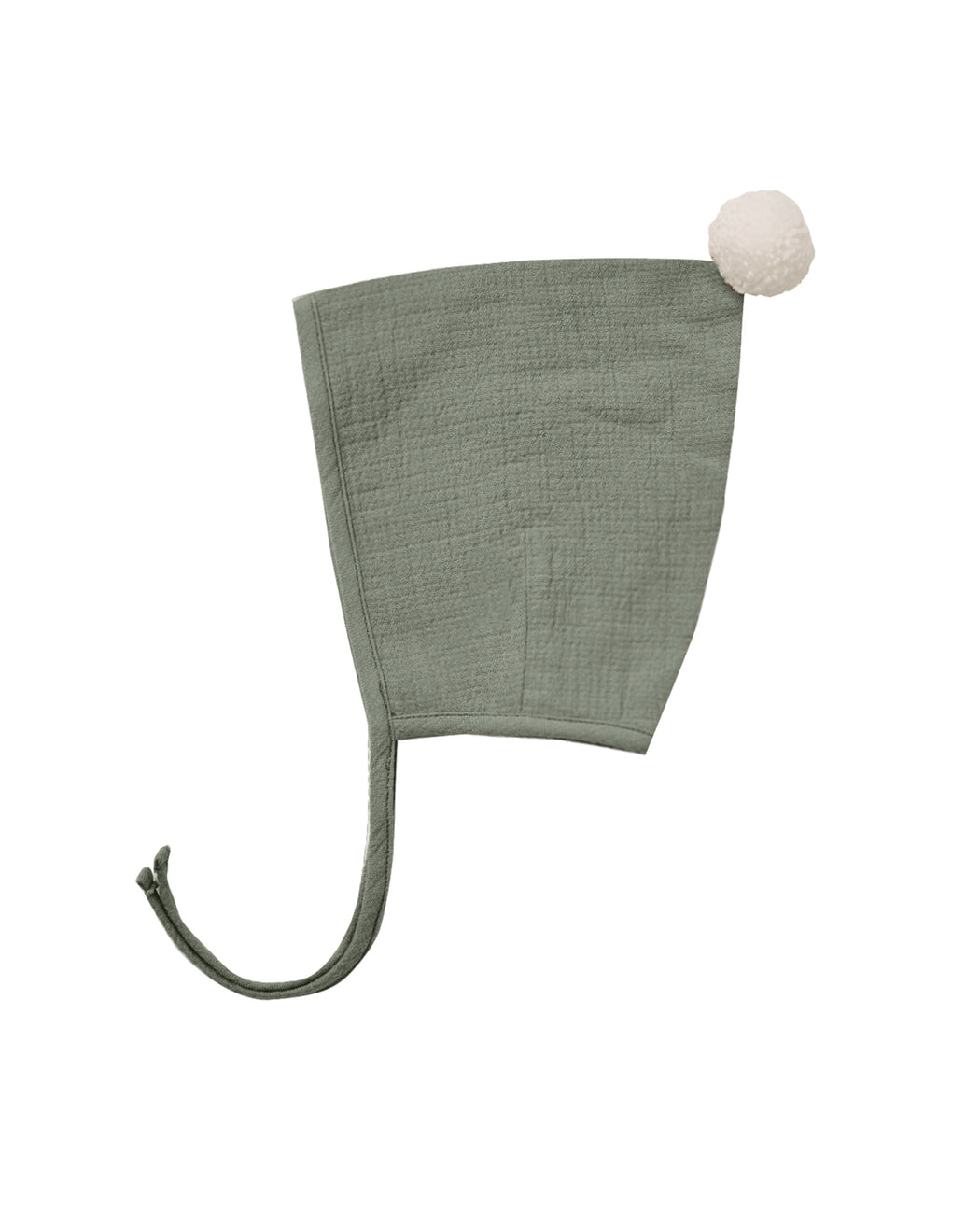 An organic cotton pixie bonnet in a lightweight gauze fabric with pom pom at the top. Ties at neck.
