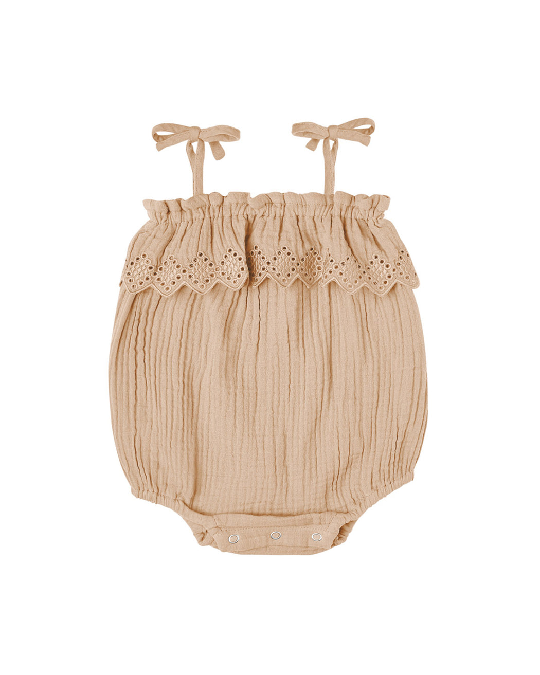 Eyelet details at the top edge, adjustable tie straps, snap closures at the bottom, and elastic at the leg openings come together for a very cute baby romper.
